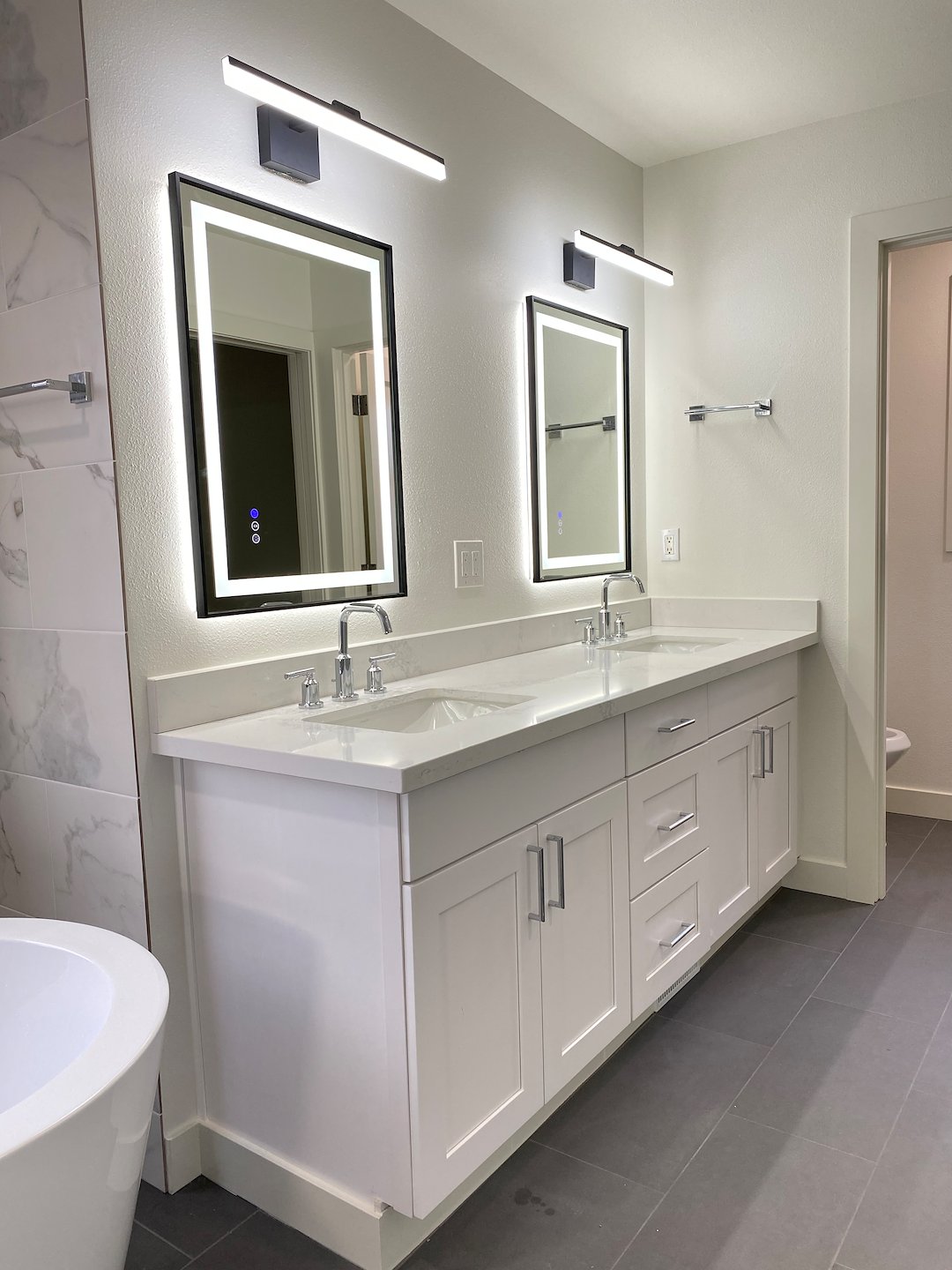 We installed large-format 12x24 porcelain tile flooring throughout the bathroom and continued the same material vertically around the tub from floor to ceiling to create a seamless look and simplify cleaning.