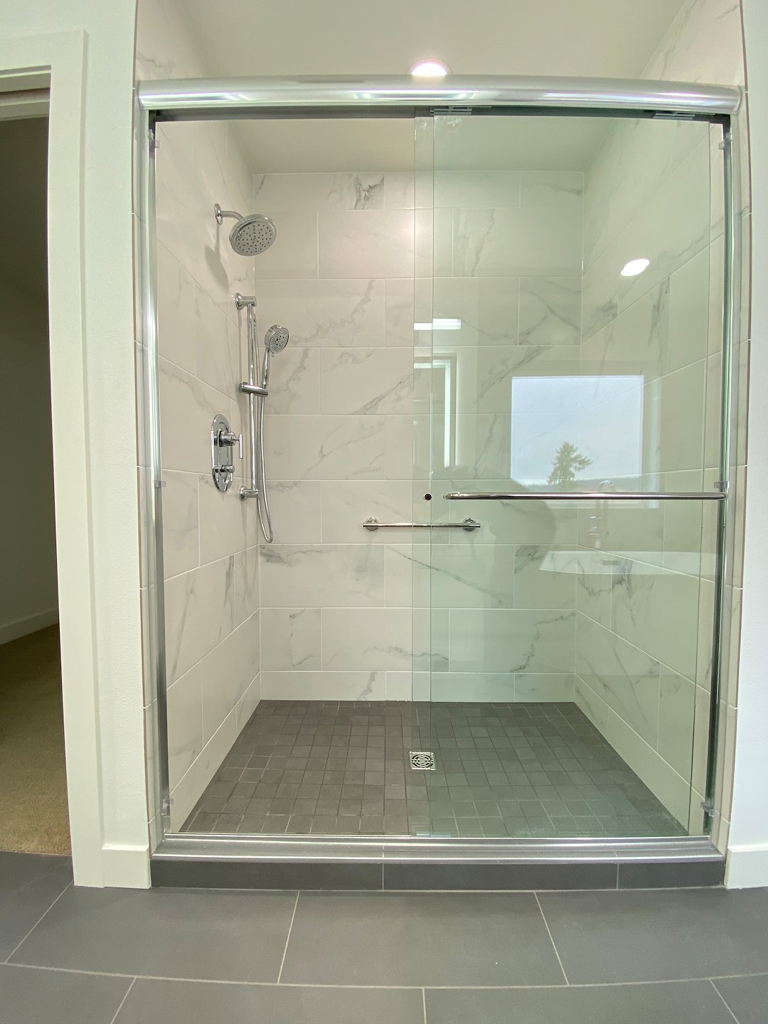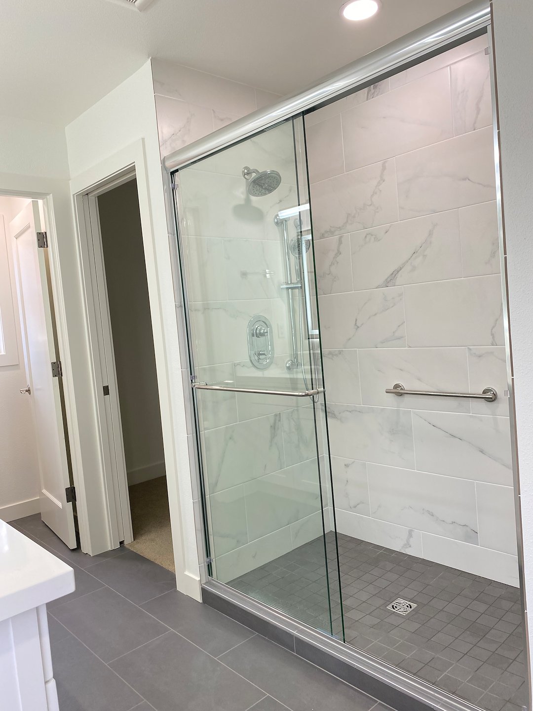 The shower walls use matching large-format tile, while a coordinating mosaic tile was installed on the shower floor to improve drainage and slip resistance.