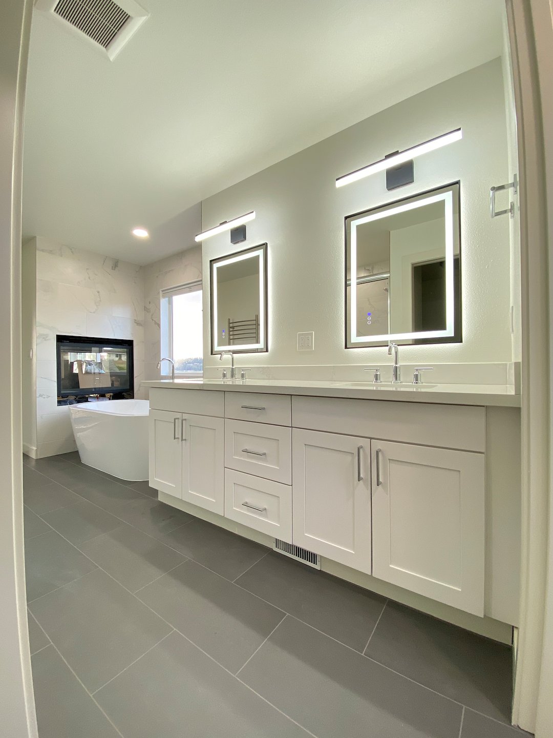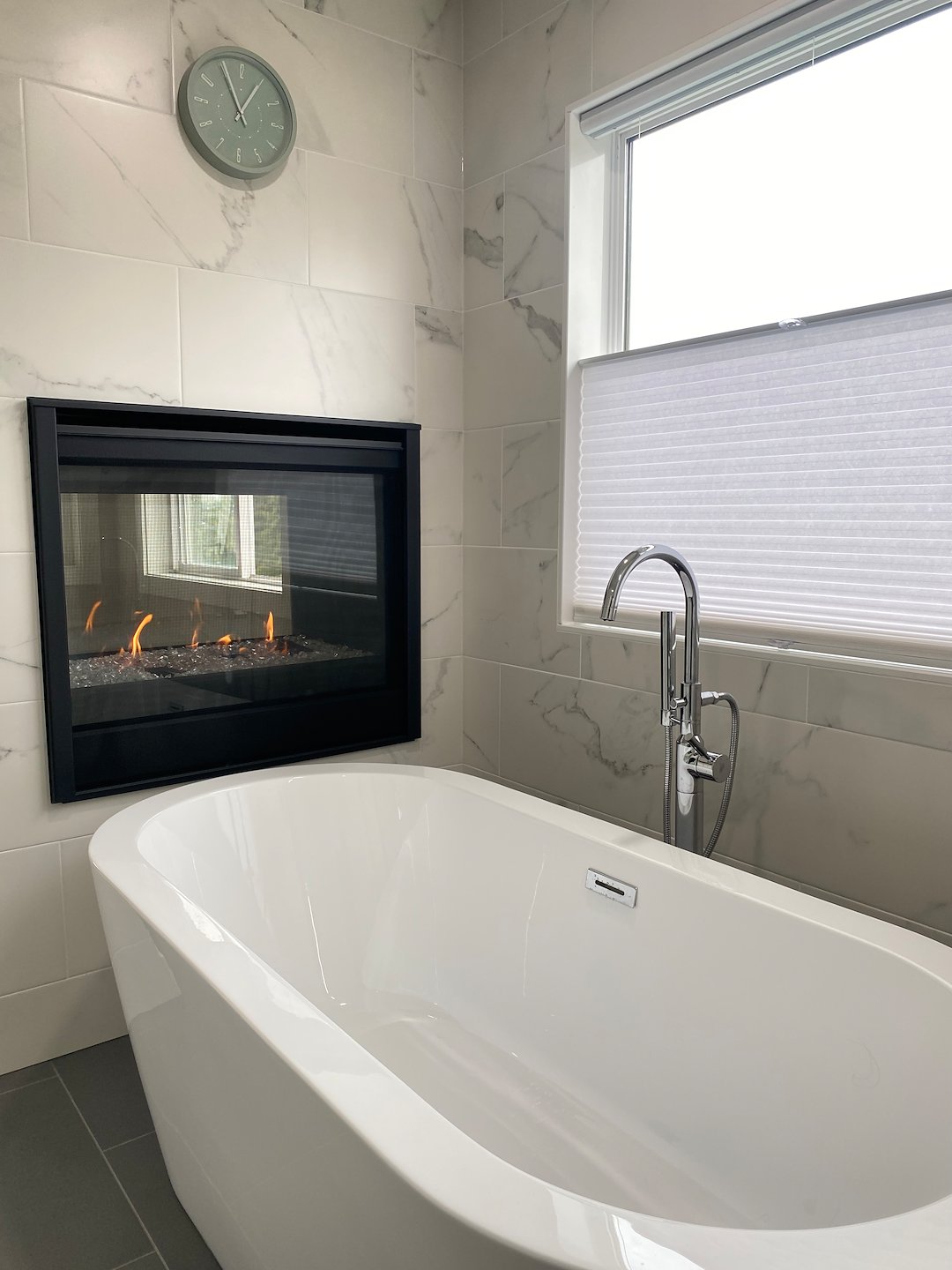 The shared fireplace creates visual continuity with the bedroom, the freestanding tub provides a relaxation feature, and the heated towel bar improves everyday comfort. Updated lighting and layout make daily routines easier and more practical.
